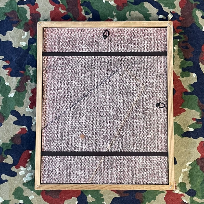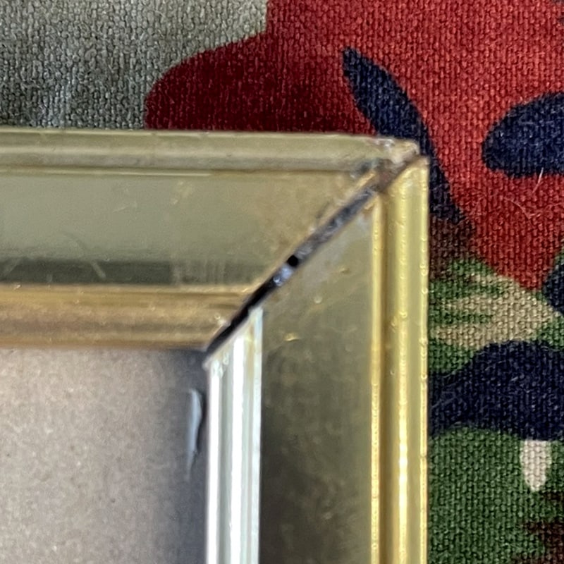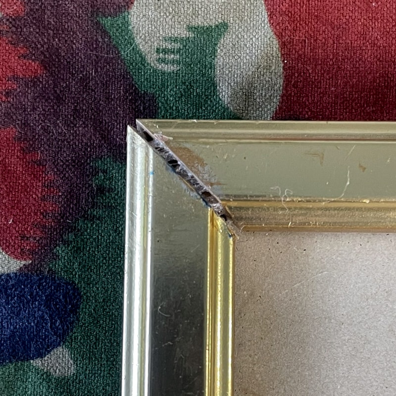 Rahmen berieben und bestossen, Lackabsplitterungen vorhanden. Holz in drei Ecken verzogen, siehe Produktfotos.