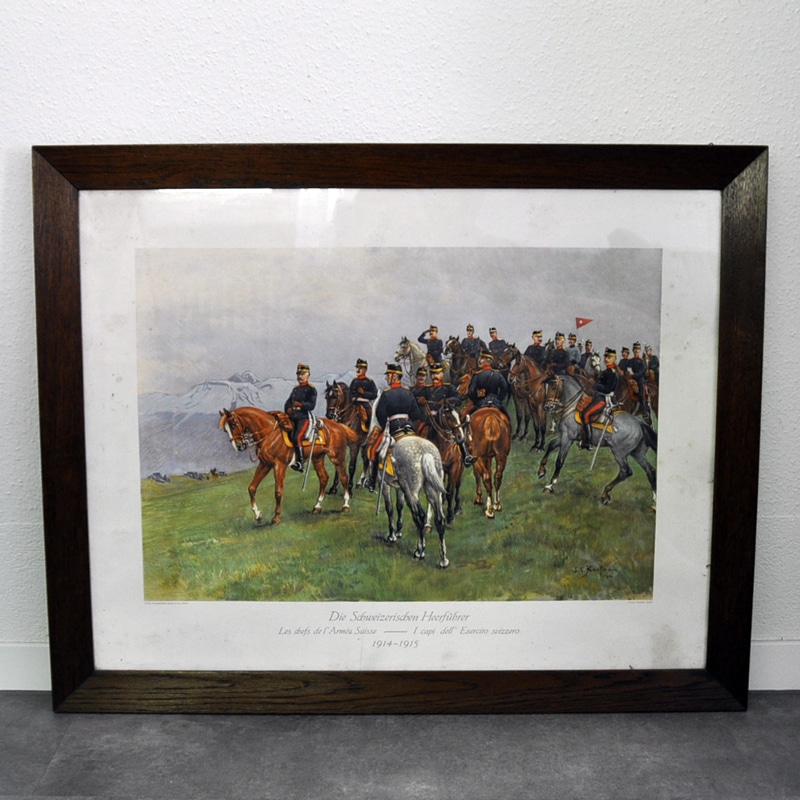 Wunderschönes, polychromes und grossformatiges Bild der damaligen Schweizer Heerführer, gerahmt hinter Glas. Aufhängeösen vorhanden. Rahmen aus Eichenholz. Druck durch das polygraphische Institiut A.-G. Zürich, Verlag Photoglob, Zürich. Gemalt durch J.C. Kaufmann, 1914.