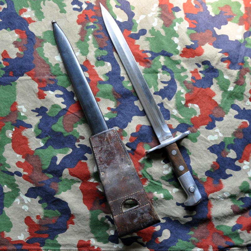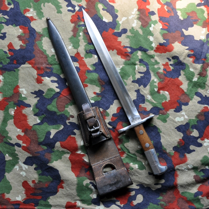 Zustand: Gut, altersbedingte Gebrauchsspuren vorhanden, Leder angelaufen, Klinge grobgereinigt.