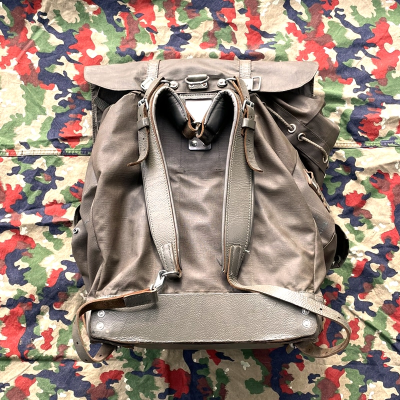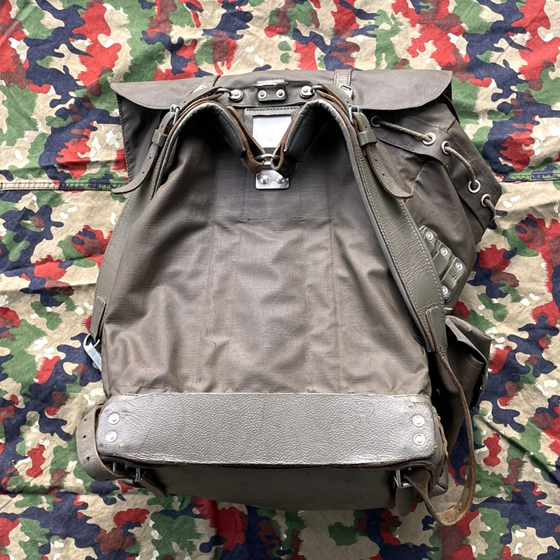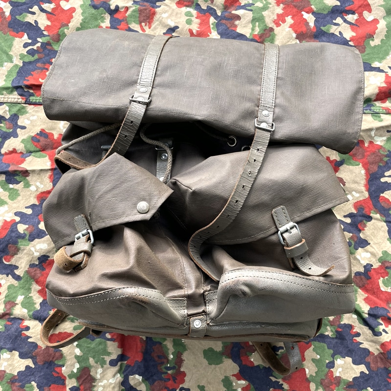 Gebirgsrucksack aus plastifiziertem Material, Boden aus Leder. Zusätzliches Fach im Deckel vorhanden. Zustand ungereinigt. Gurtzeug intakt.