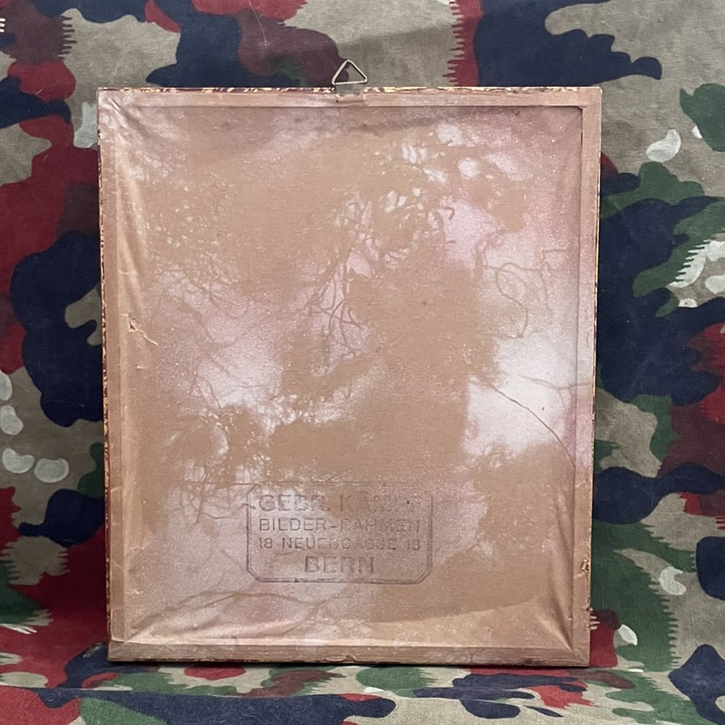 Zustand dem Alter entsprechend Sehr gut, grobgereinigt. Rahmen aus Holz, im Vintage-Look gehalten. Aufhangöse auf der Rückseite befindlich. Keine Chips oder Risse im Glas. Gerahmt durch Gebrüder Kämpf, Neuengasse 18, Bern. Rückseite verfärbt.