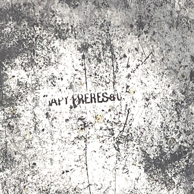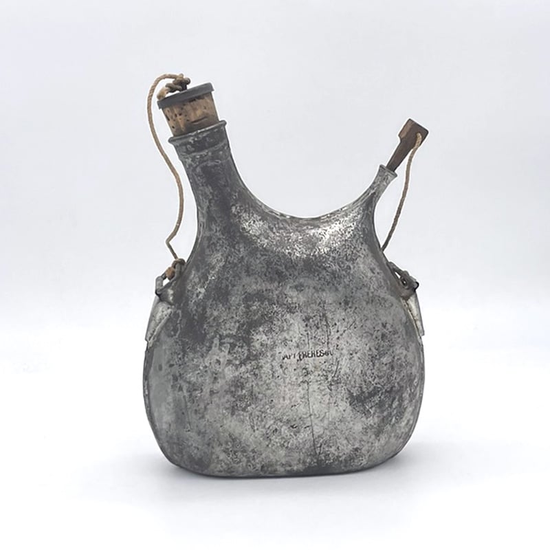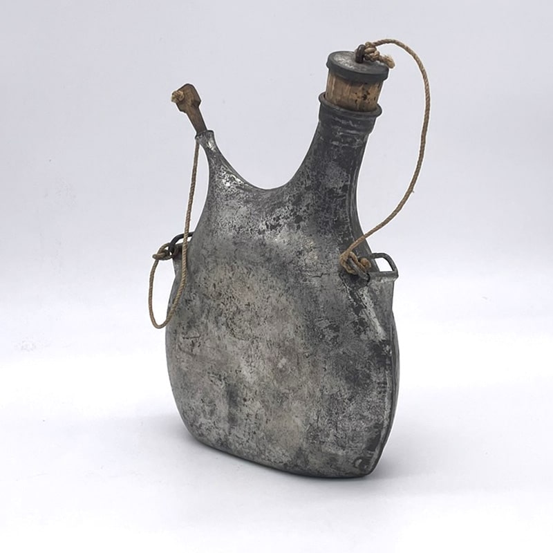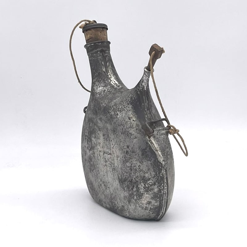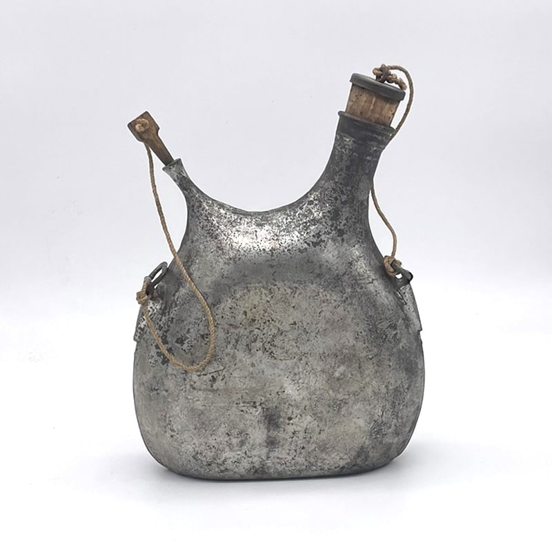 Labeflasche aus verlötetem Weissblech. Zustand dem Alter und Verwendungszweck entsprechend Gut bis Sehr gut, ungereinigt. Gebrauchsspuren vorhanden. Korkzapfen und Holzstössel klemmen.
