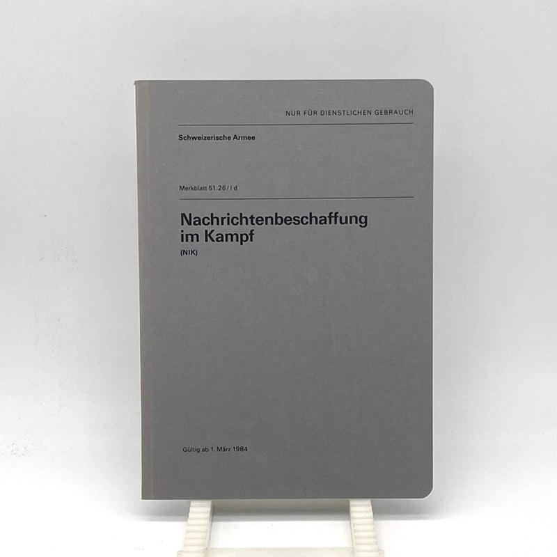 Merkblatt (51.26/Id) über die Nachrichtenbeschaffung im Kampf der Schweizer Armee aus dem Jahr 1984 auf total 12 Seiten.