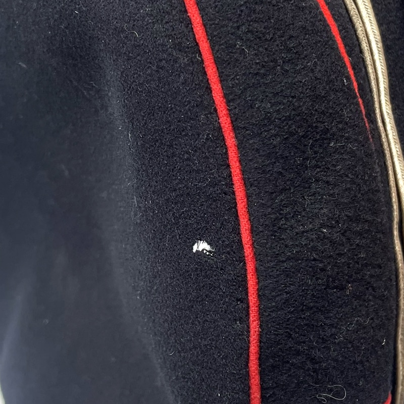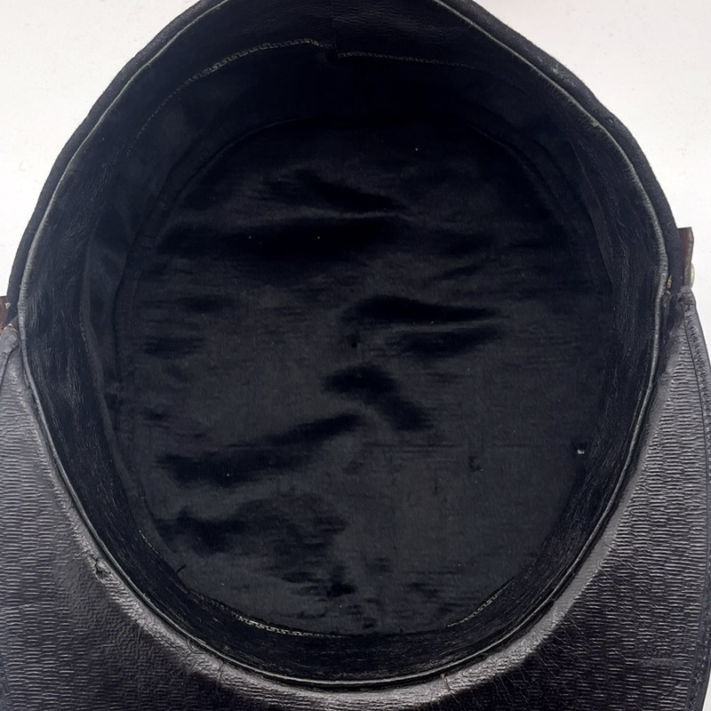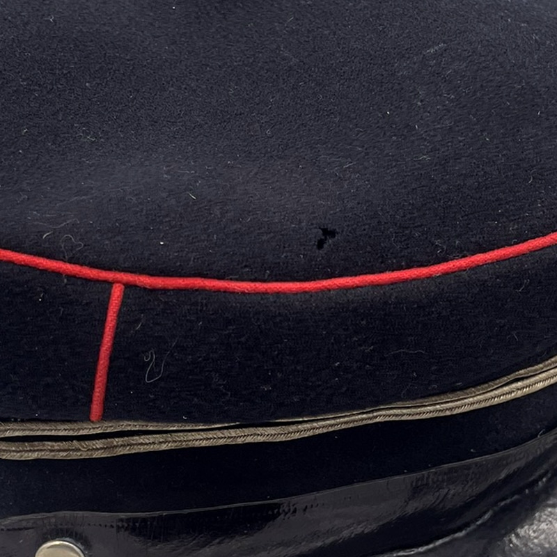Zustand: Dem Alter und Verwendungszweck entsprechend Gut bis Sehr gut, grobgereinigt. Alterungsspuren vorhanden, Innenband leicht berieben. Innenfutter gut, Herstellerkennzeichnung nicht mehr ersichtlich. Sturmband seitlich mit zwei Knöpfen angebracht, Schnalle berieben. Stoff weist Abriebspuren auf, Löcher vorhanden. Lederschirm intakt, gewölbt. Leichte Abplatzungen am Lederschirm vorhanden. Gallons silberfarbig, Patina vorhanden.