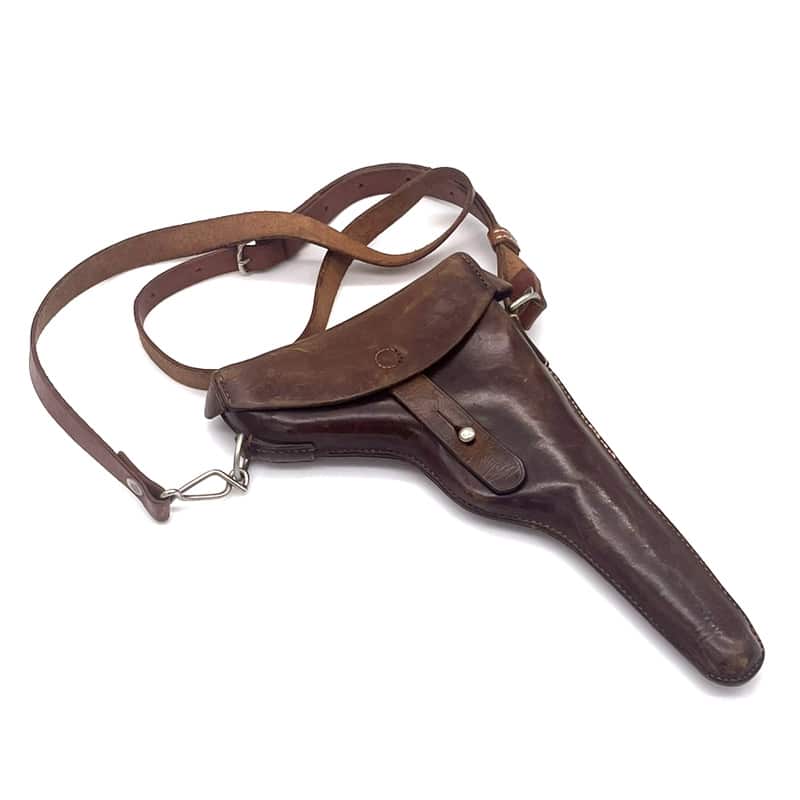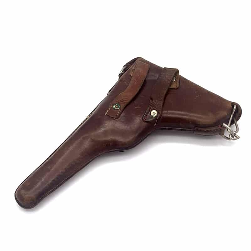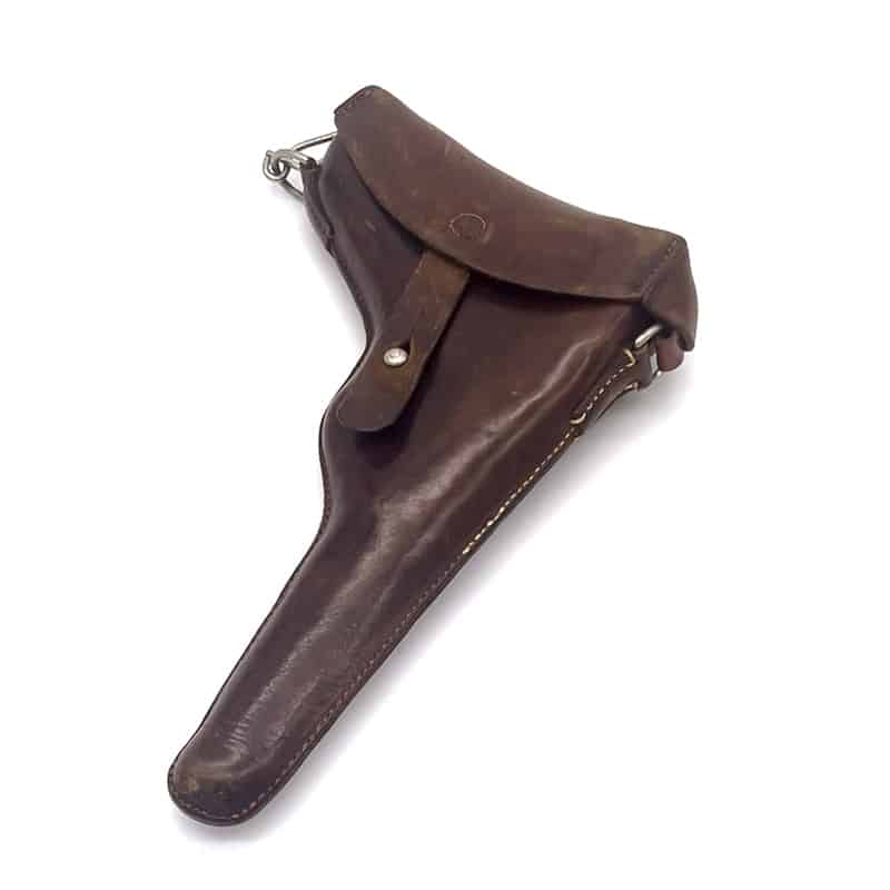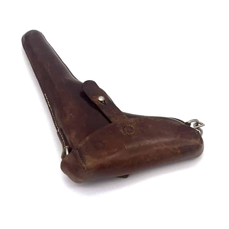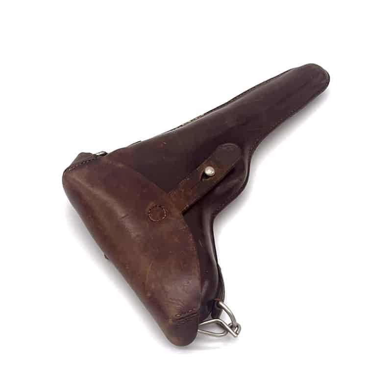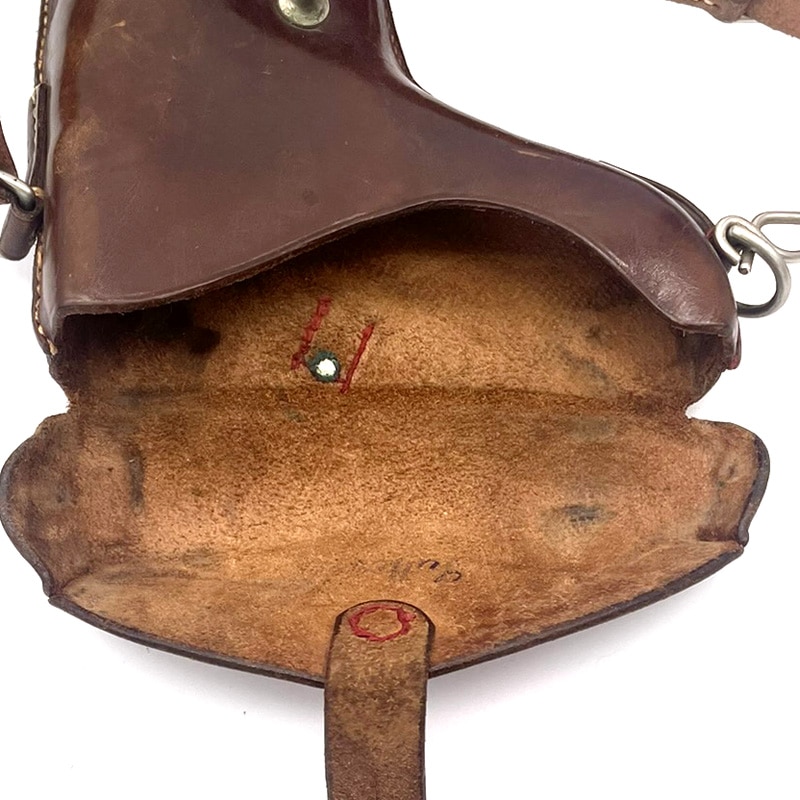 Pistolenholster für Parabellum Ord. 00/06 aus Leder, inklusive Trageriemen. Holster: Sattler ED. Frauchiger Bern 1906. Trageriemen ohne Stempelung.