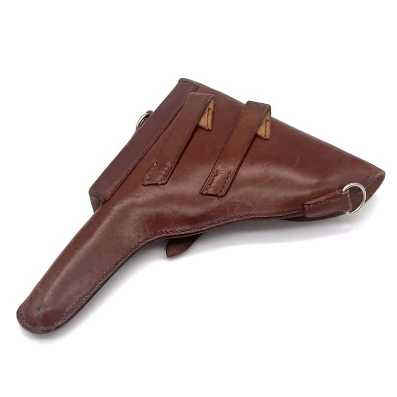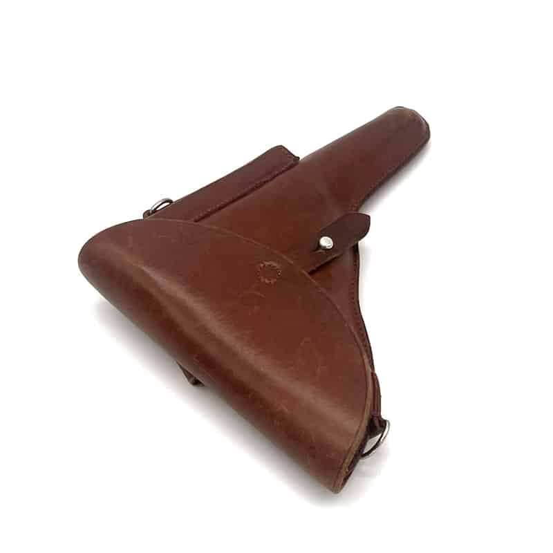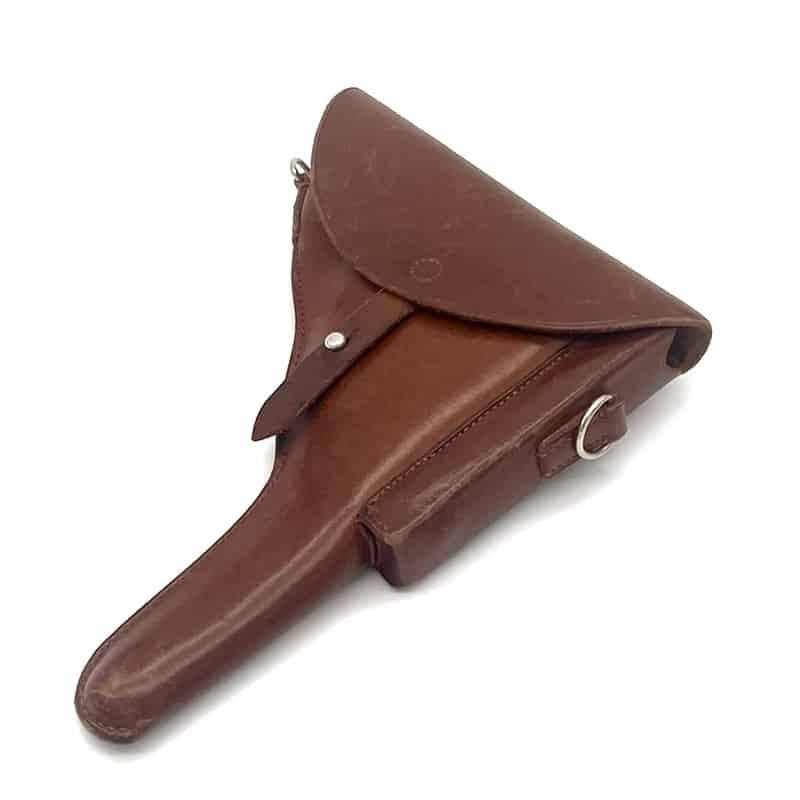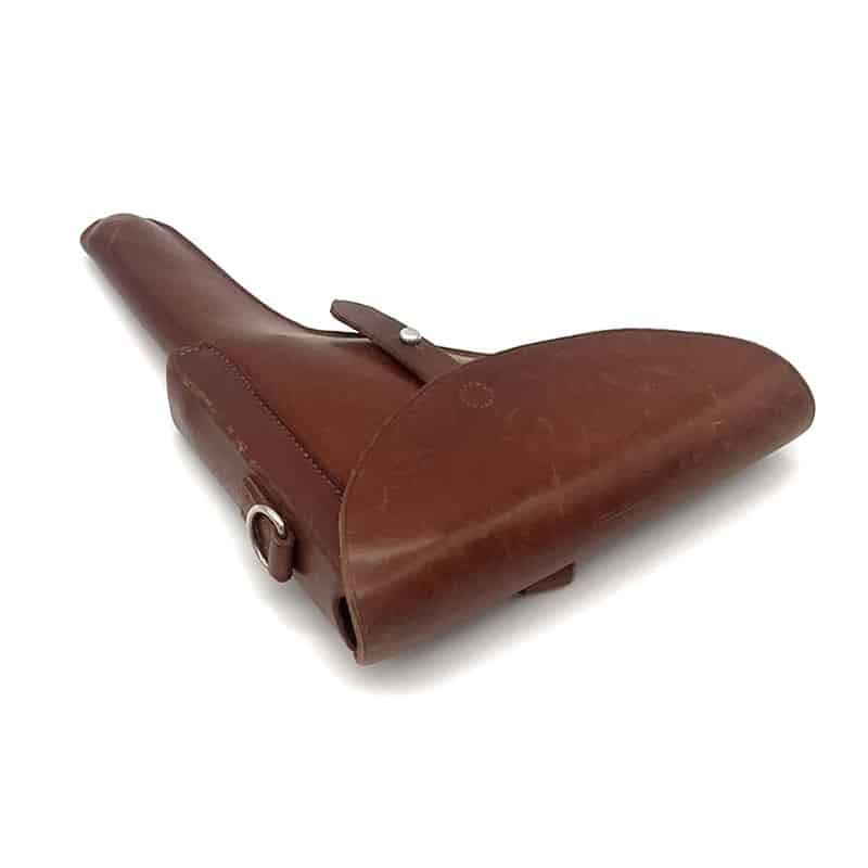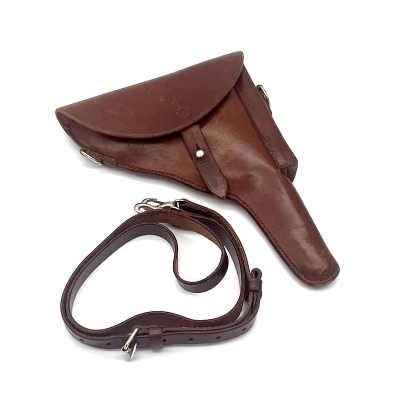 Pistolenholster für Parabellum Ord. 06/29 aus Leder, Magazintasche auf der Vorderseite befindlich. Inklusive Trageriemen. Holster sowie Trageriemen ungestempelt.