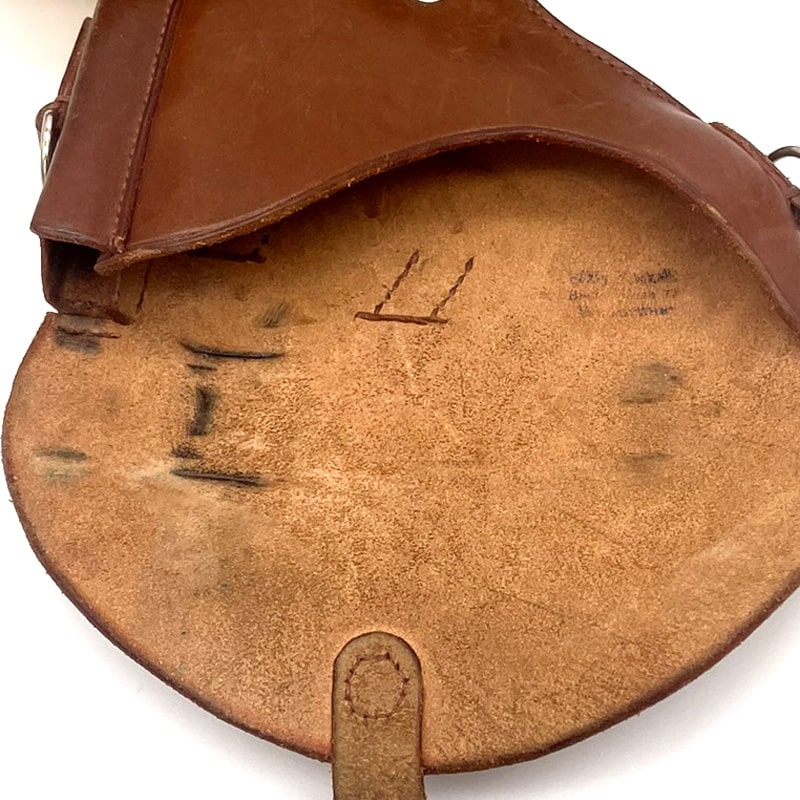 Zustand dem Alter und Verwendungszweck entsprechend Sehr gut, ungereinigt. Leder nicht steif, jedoch berieben und teils bestossen. Trageriemen sowie Gurtschlaufen intakt. Grünspan möglich.