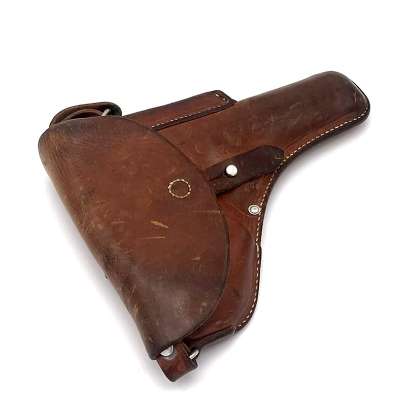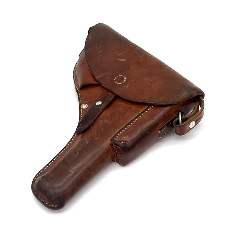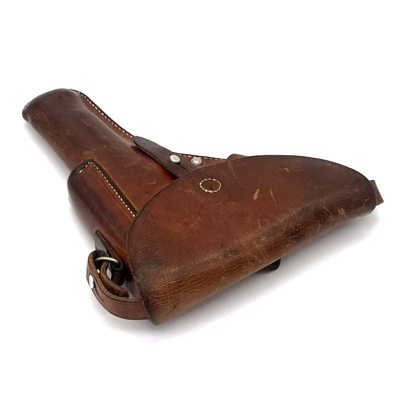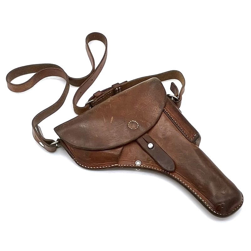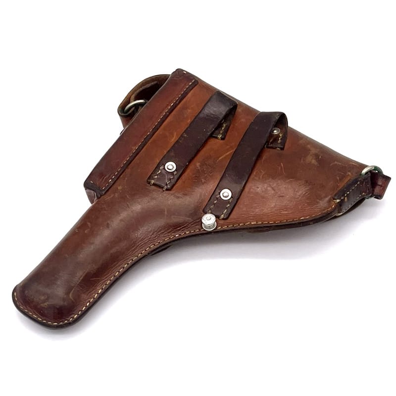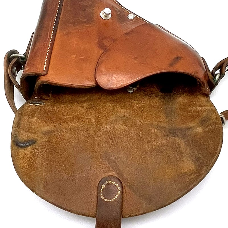Pistolenholster für P49 (SIG P210) aus Leder, Magazintasche auf der Vorderseite befindlich. Inklusive Trageriemen. Holster: Sattler ED. Tinguely Alterswil 1963, Abnahmestempel „J“ auf Deckelinnenseite vorhanden. Trageriemen: Abnahmestempel „RK“ auf Trageriemen ersichtlich, Sattler A. Mollet Tavannes. Trageriemen aus dem Jahr 1970.