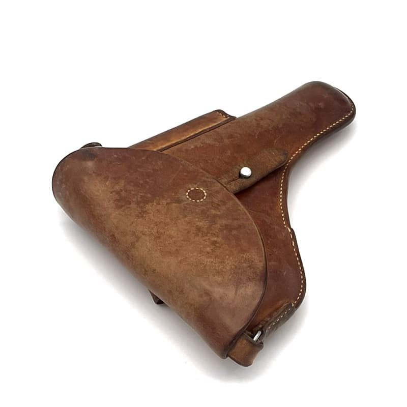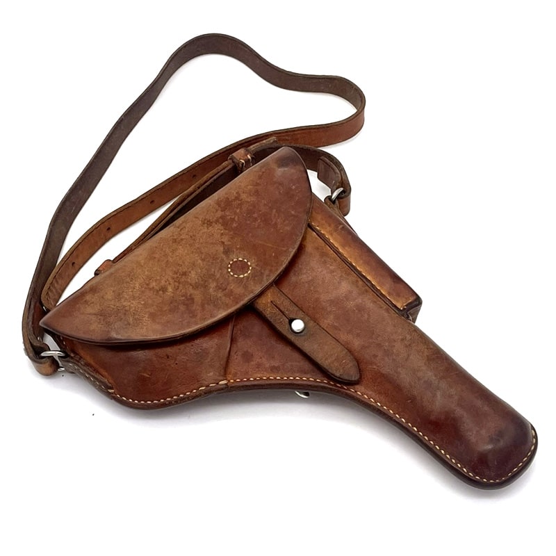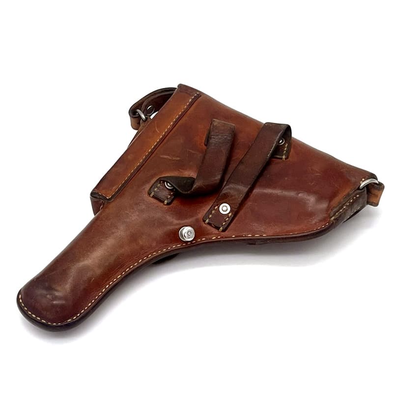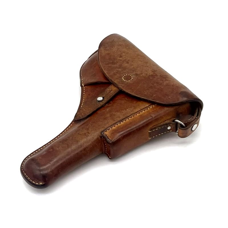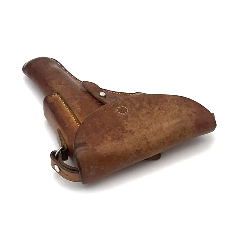 Pistolenholster für P49 (SIG P210) aus Leder, Magazintasche auf der Vorderseite befindlich. Inklusive Trageriemen. Holster: Sattler Hans Wirz Gelterkinden 1911, Abnahmestempel „RK“ vorhanden. Trageriemen: Kreuzpunze auf Trageriemen ersichtlich, Sattlerangaben nicht mehr leserlich. Trageriemen aus dem Jahr 1971.