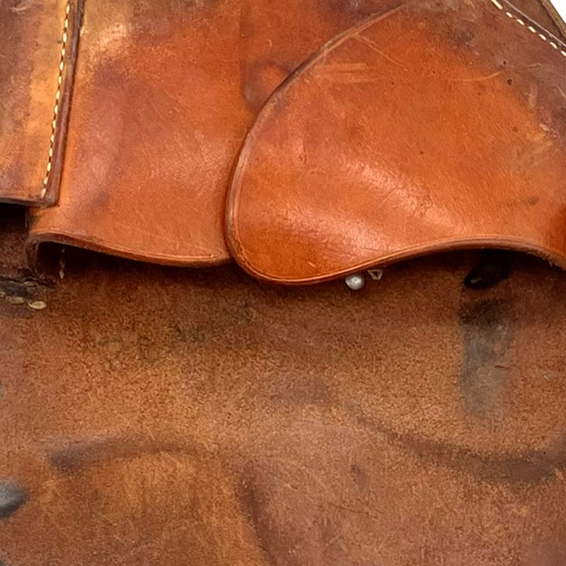 Zustand dem Alter und Verwendungszweck entsprechend Gut bis Sehr gut, ungereinigt. Leder nicht steif, jedoch berieben und teils bestossen. Trageriemen sowie Gurtschlaufen intakt. Grünspan teils vorhanden.